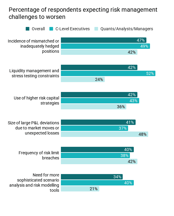 Despite the heightened restrictions, traders are also expecting a rise in risk management challenges with mismatched or inadequately hedged positions seen as the biggest threat, by 48% of traders. They also expect a range of risk management concerns to increase, including liquidity management and stress testing constraints as well as the use of higher risk capital strategies.